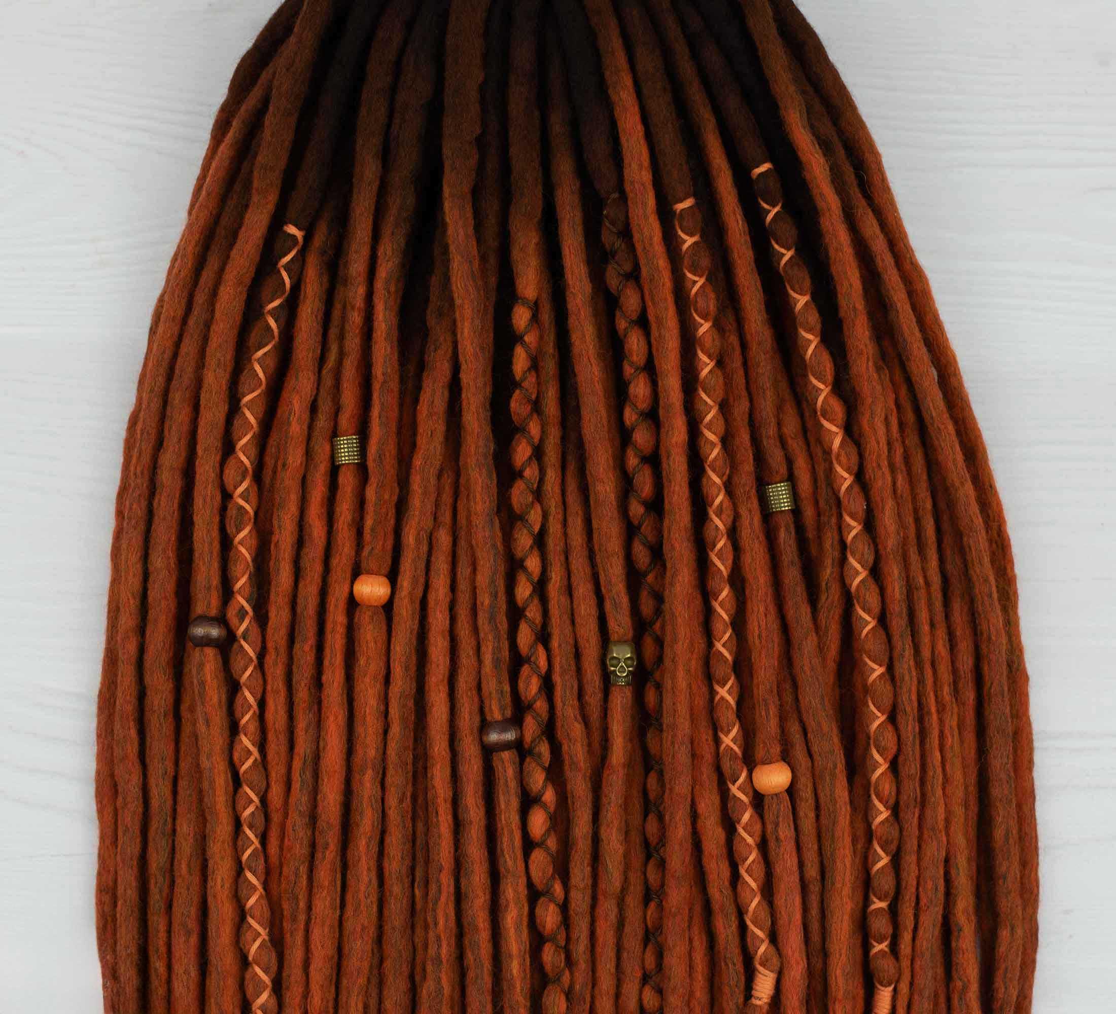 Discover the gorgeous African Daisy Wool Dreadlock Set - a stunning ode to the vibrant hues of autumn, with warm oranges, rich browns and a captivating ombre transition that begins with deep coffee brown roots. Crafted with precision and love, this set is more than just a hair accessory; it's a work of art inspired by the stunning African daisy flower.