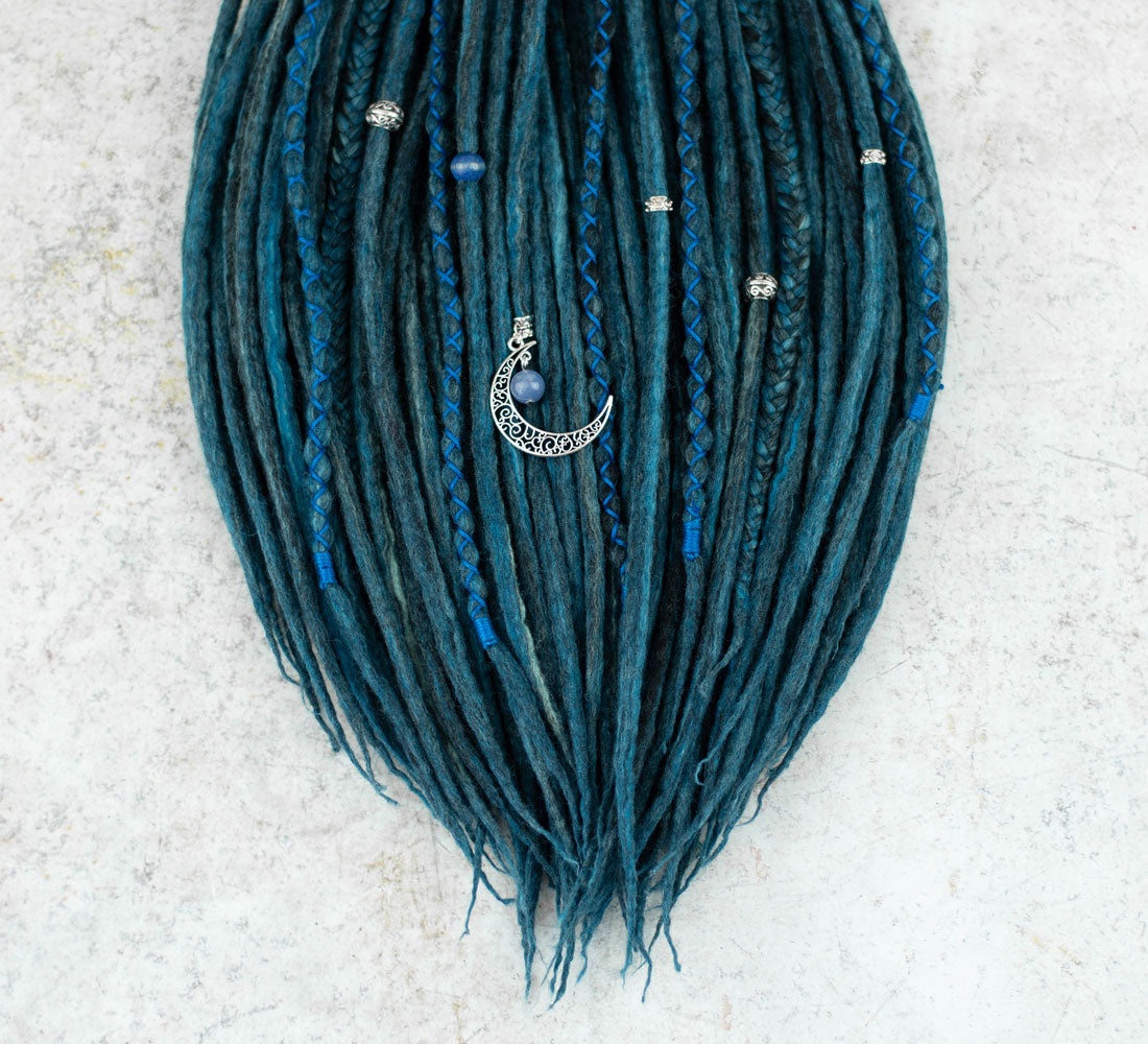 Add a touch of bohemian elegance to your look with our handmade wool dreadlocks. Made from extra soft merino wool, these lightweight and comfortable wool dreads comes in stunning shades of blue. Easy to maintain, each set features beautifully decorated dreadlocks and braids.