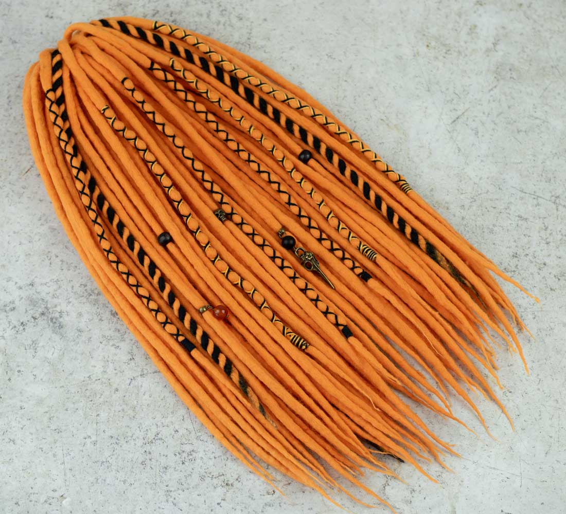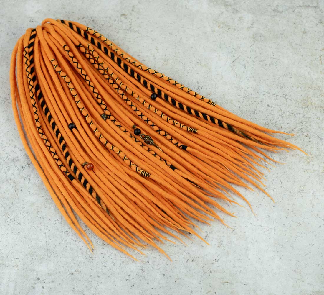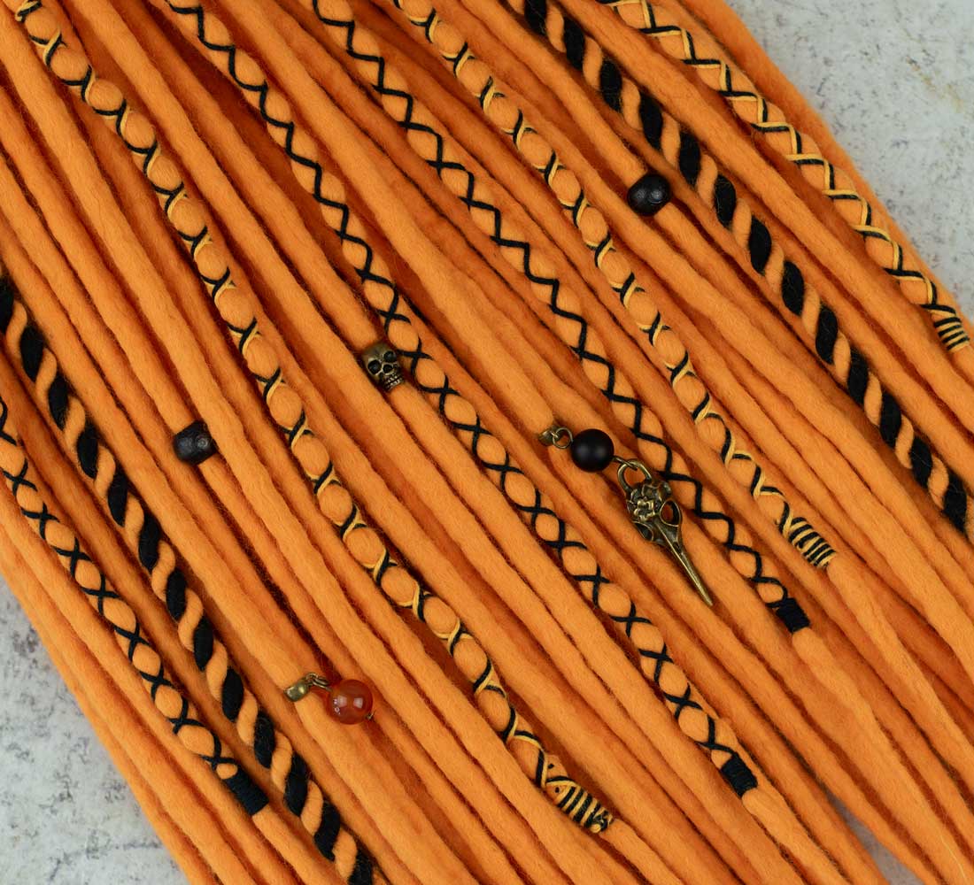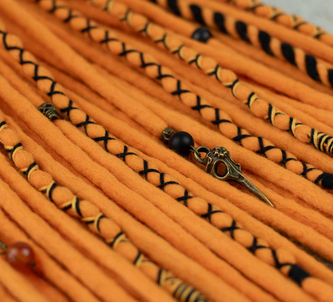 Be amazed by the warm, glowing hues of the Candlelight wool dreadlock set. The soft light orange base is complemented by a deep black color, inspired by the mesmerizing beauty of flickering candlelight at sunset - a symbol of warmth, comfort and inner peace.
