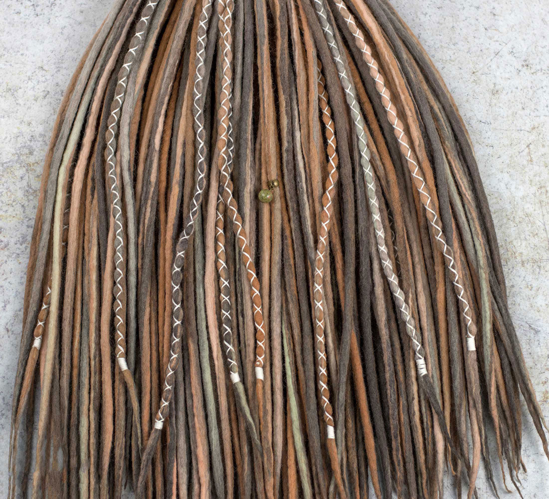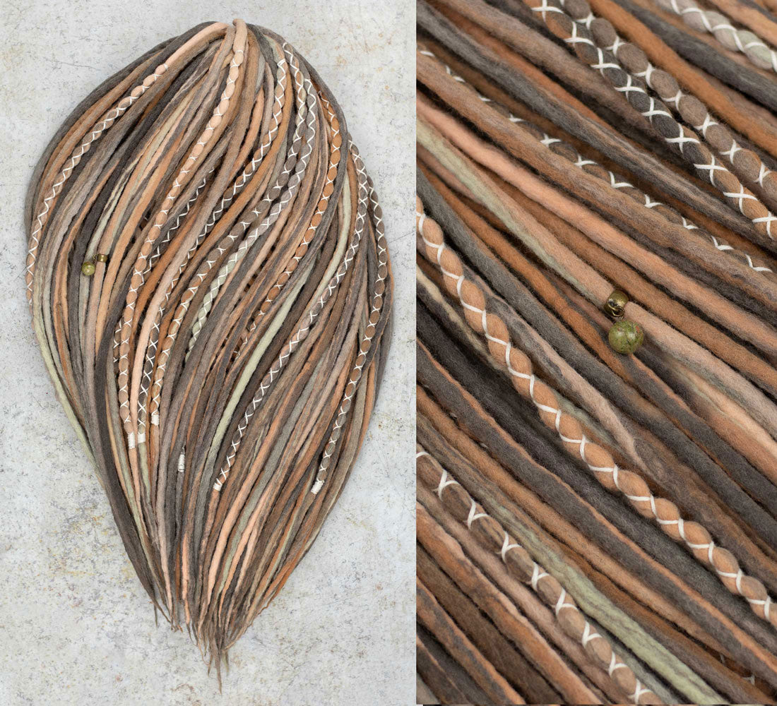 The mill dyed wool and yarn is toxic free, and complies with the OEKO-TEX 100 and GOTS requirements. We use high quality mulesing free extra fine merino wool for dreads. The dreadlocks are decorated with cotton yarn. We make the dreads with wet felting technique.