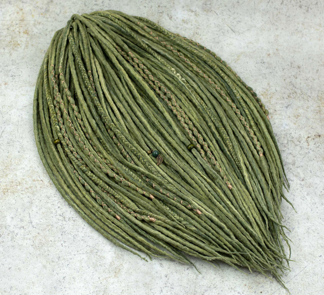 Discover what it feels like to wear these Moss green fairy dreadlocks in a full set, or decorate your own hair with some accents. They give a soft and romantic look that enhances the fairy-inspired aesthetic. As you braid the wool dreadlocks in your hair, you're embracing a sustainable and eco-friendly material.