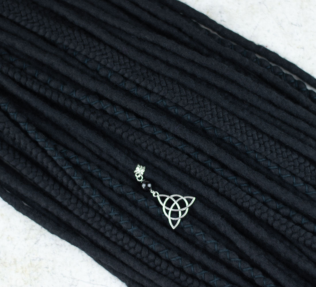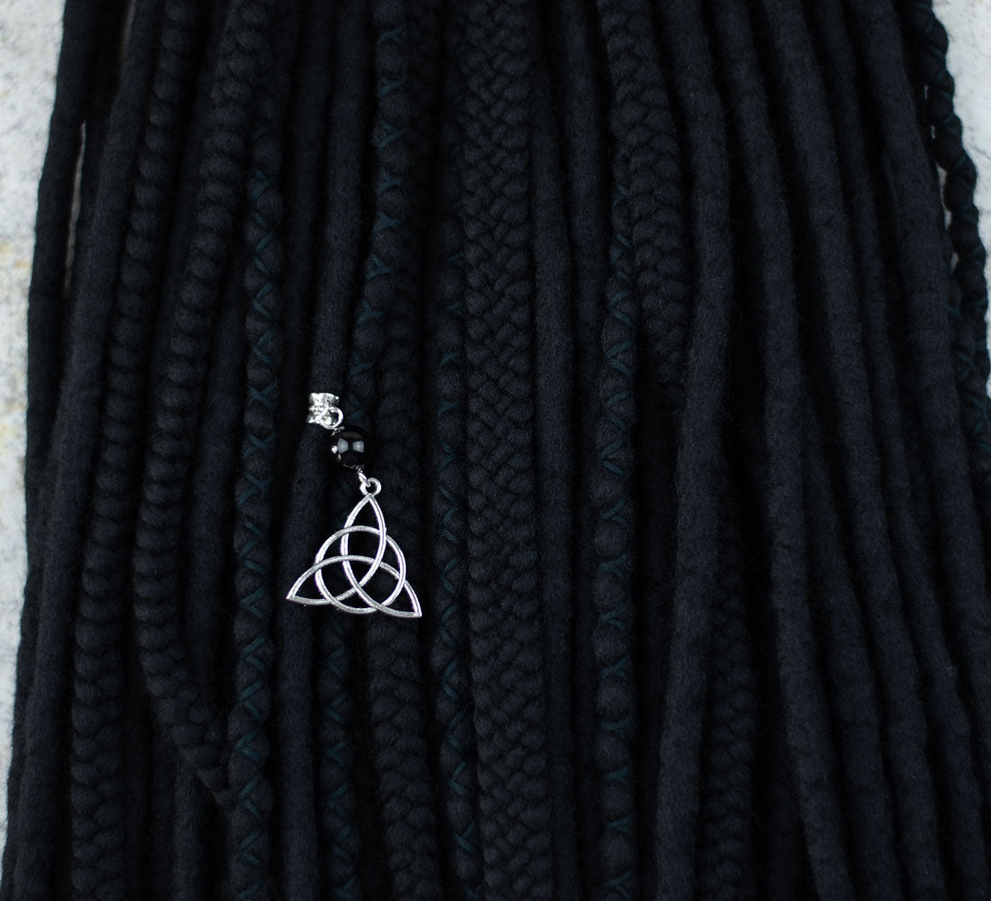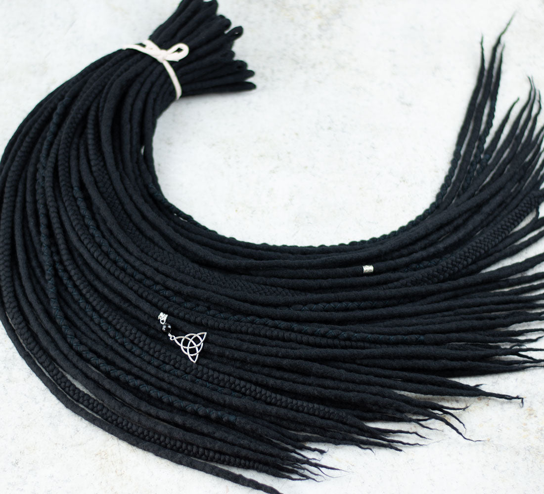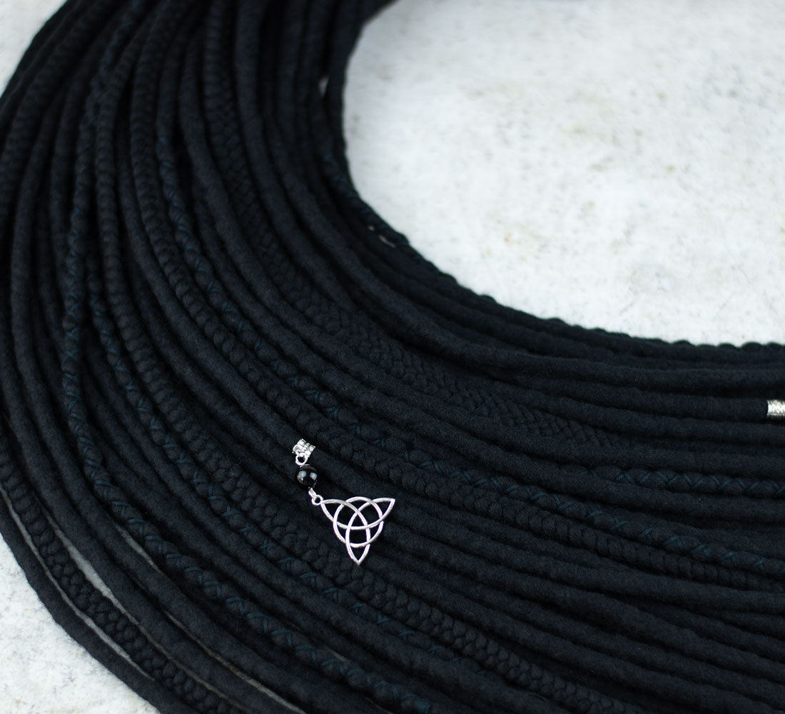Full set of single ended black wool dreadlocks. Decorated with black yarn, beads and onyx crystal. Handmade of skin-friendly, soft merino wool.