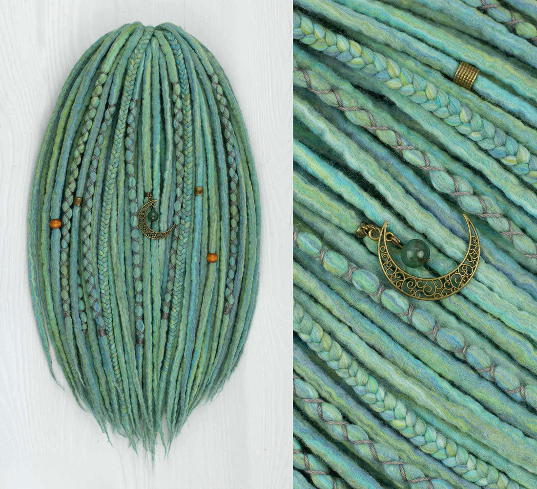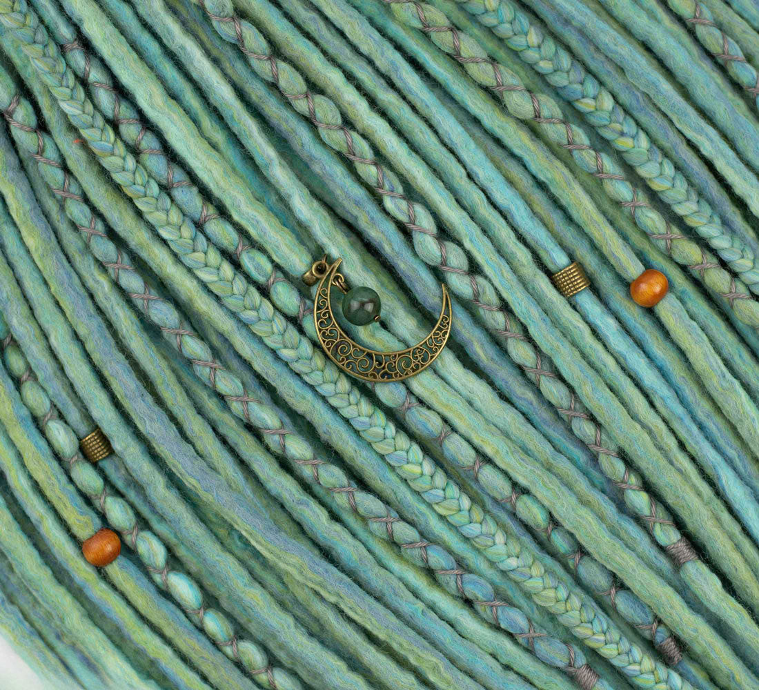 Embellished with wool dreadlocks inspired by the Luna moth, you can immerse yourself in a world of magic, where vibrant turquoise and soft light green hues dance in harmony. Each handmade dreadlock evokes the ethereal beauty of the luna butterfly's wings, exuding a sense of wonder and awe. As the delicate locks of wool fall down, they form an enchanting tapestry that evokes the soothing presence of moonlit nights and verdant meadows. Shades of turquoise and light green, moss agate crystal symbolize calm, renewal and the delicate balance of nature's wonders.