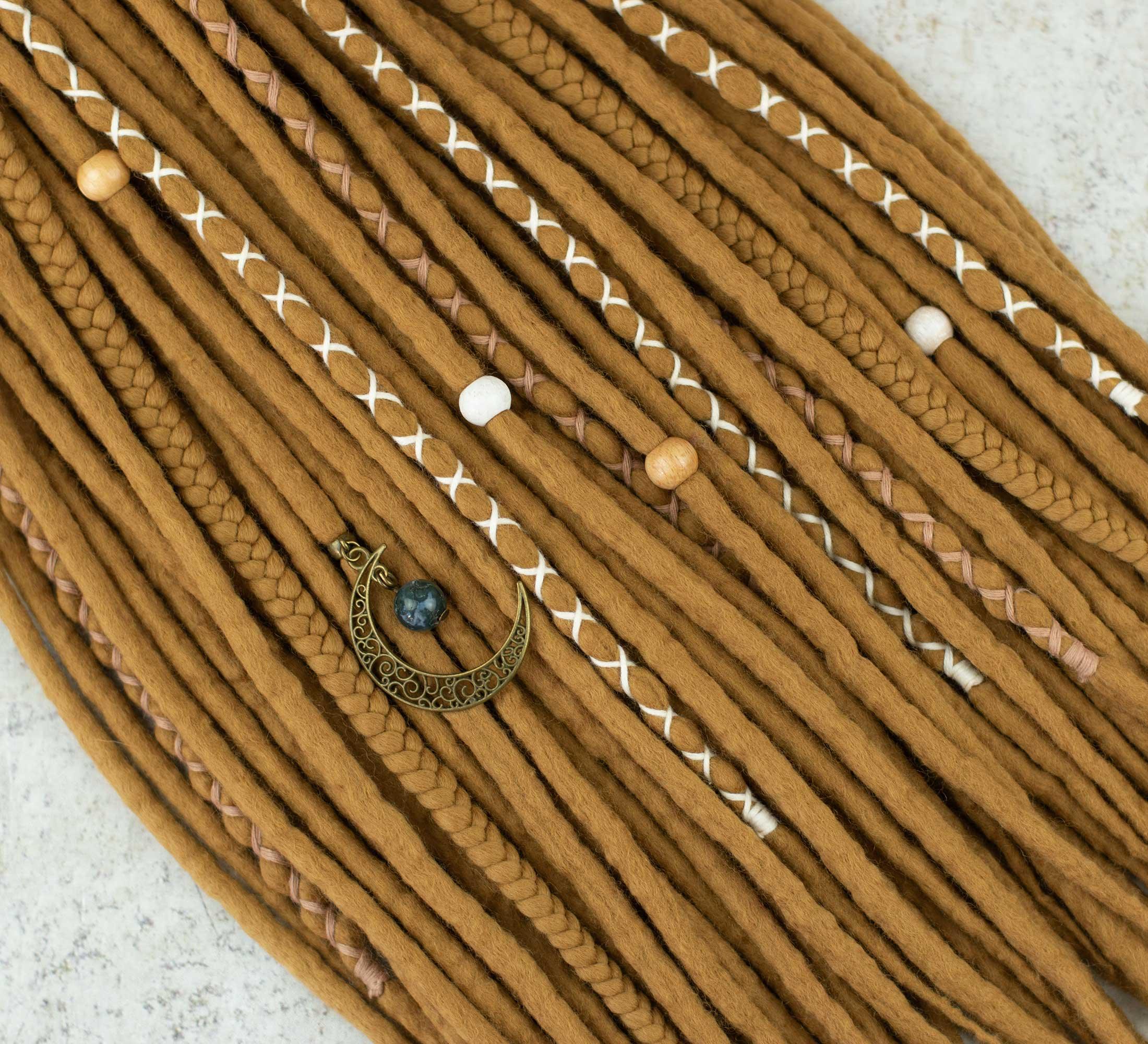 These old gold dreadlock extensions are handmade from premium quality merino wool using wet felting technique. They are incredibly soft and lightweight for comfortable wear.