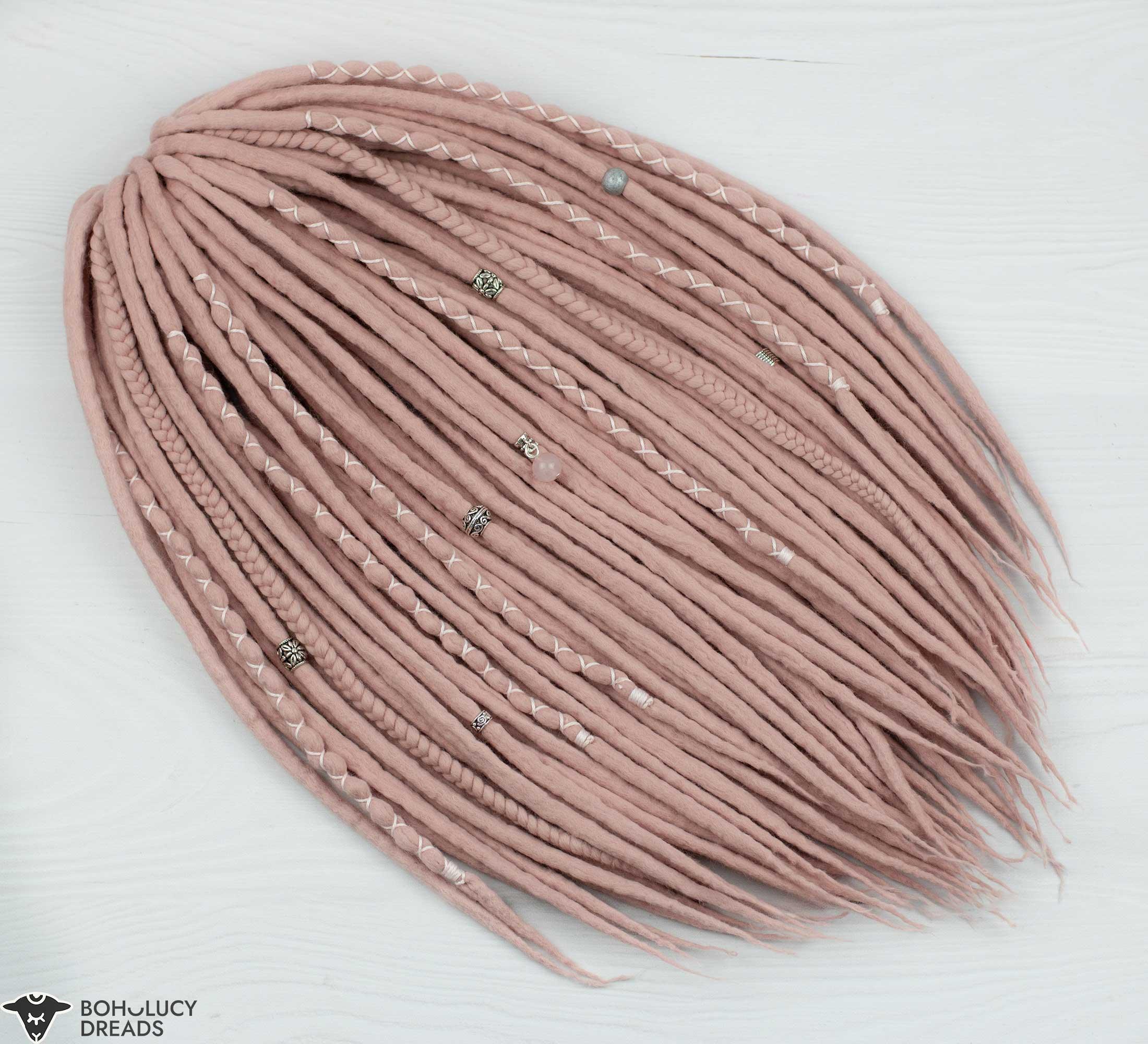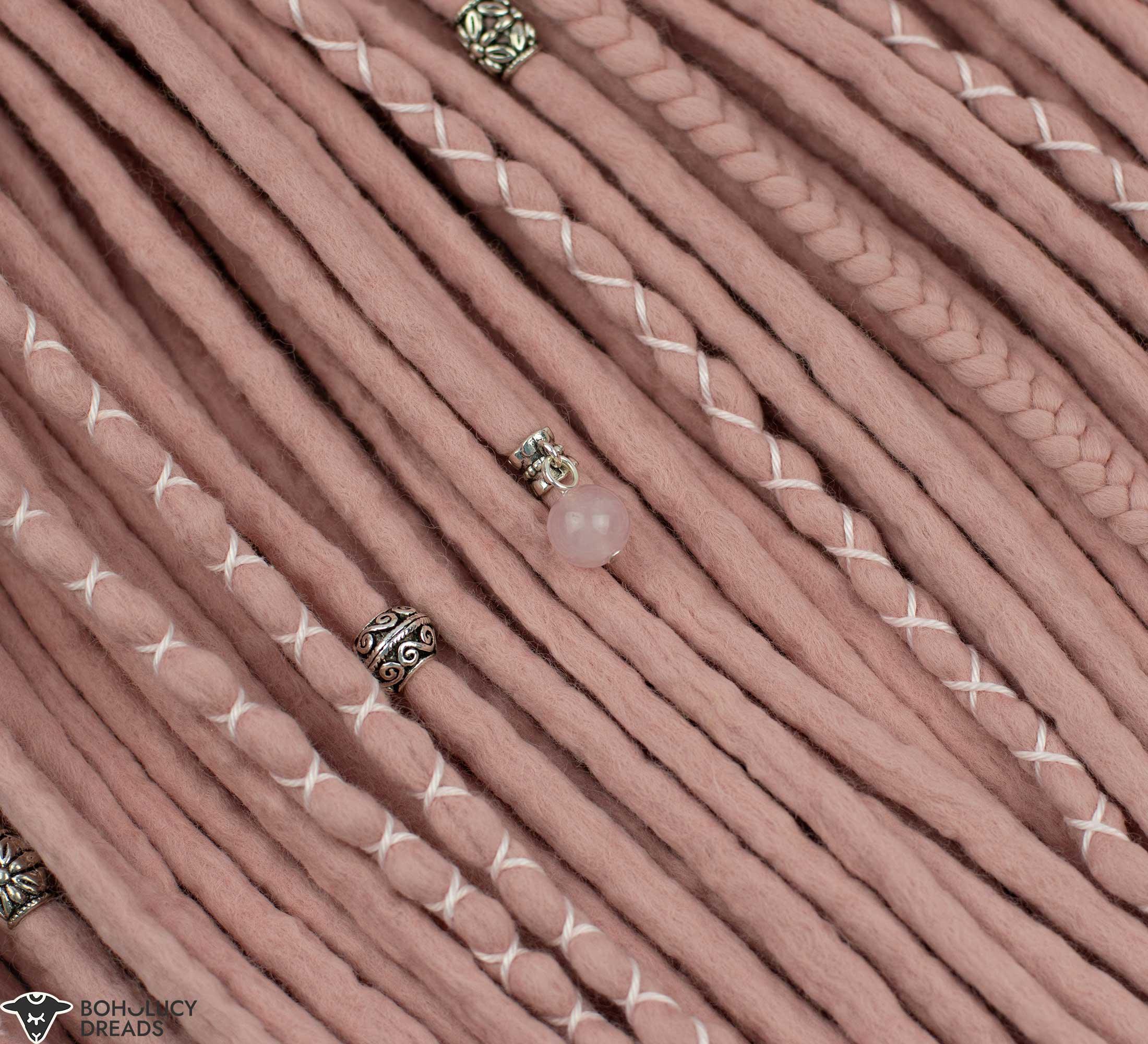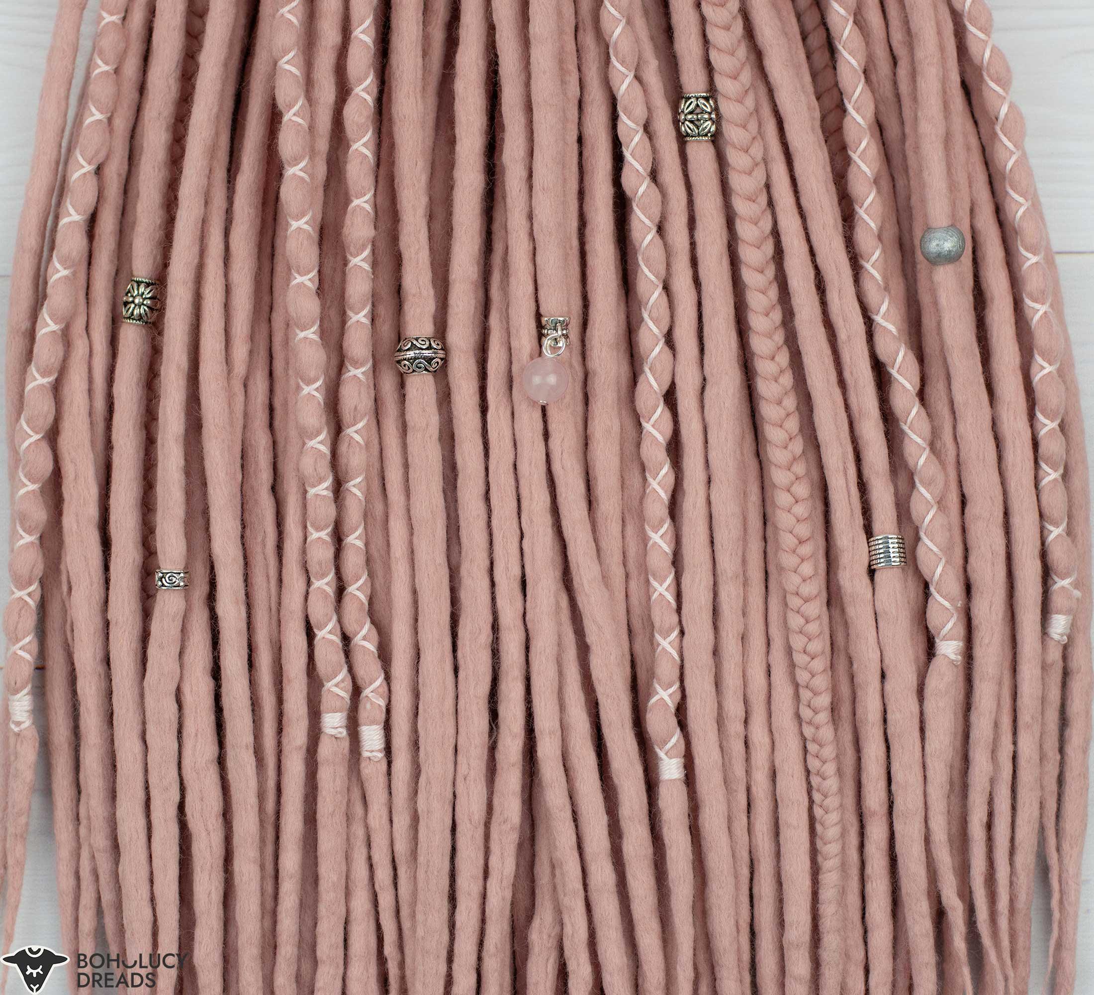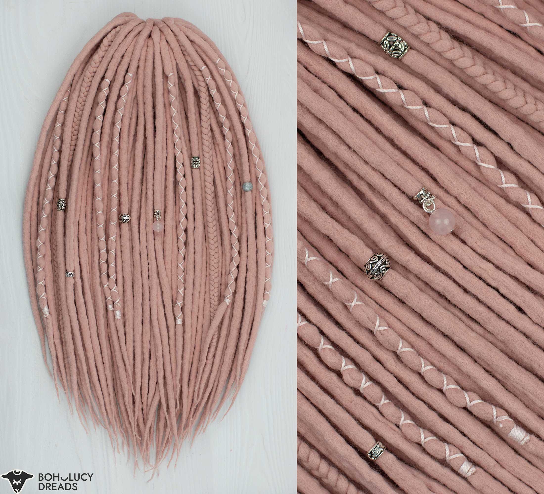 Pastel wool dreadlocks are a wonderful way to express yourself positively while enjoying the many pleasures of wool. The vibrant pastel shell color and the dread bead with rose quartz crystal add fun and cheerfulness to your look, while the natural properties of wool provide comfort, breathability and sustainability. With this unique hairstyle choice, you can show your love for nature and your own individuality. So embrace the magic of pastel wool dreadlocks and let your hair reflect the positive energy within you!