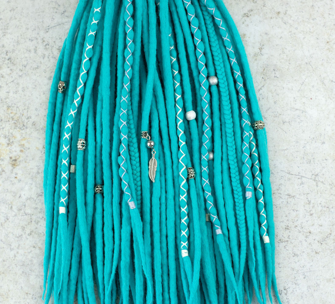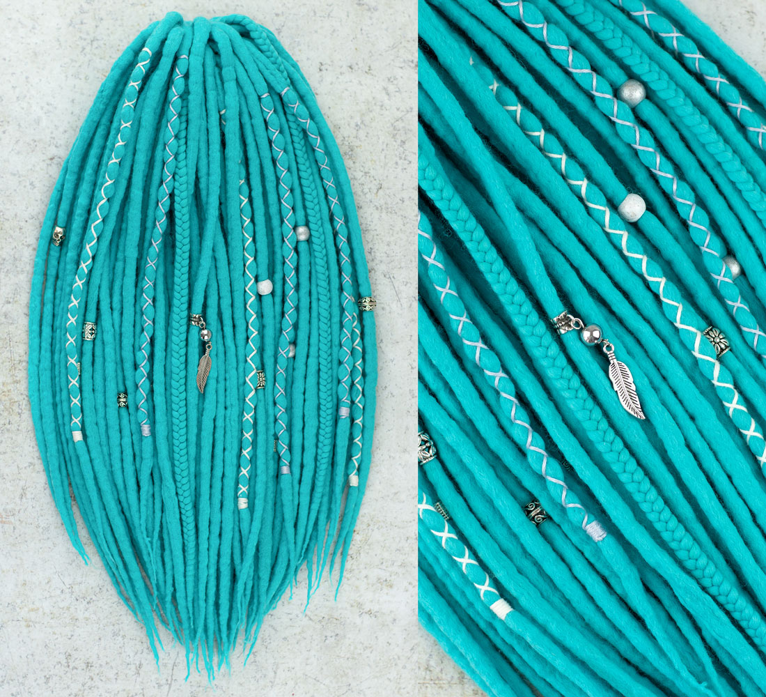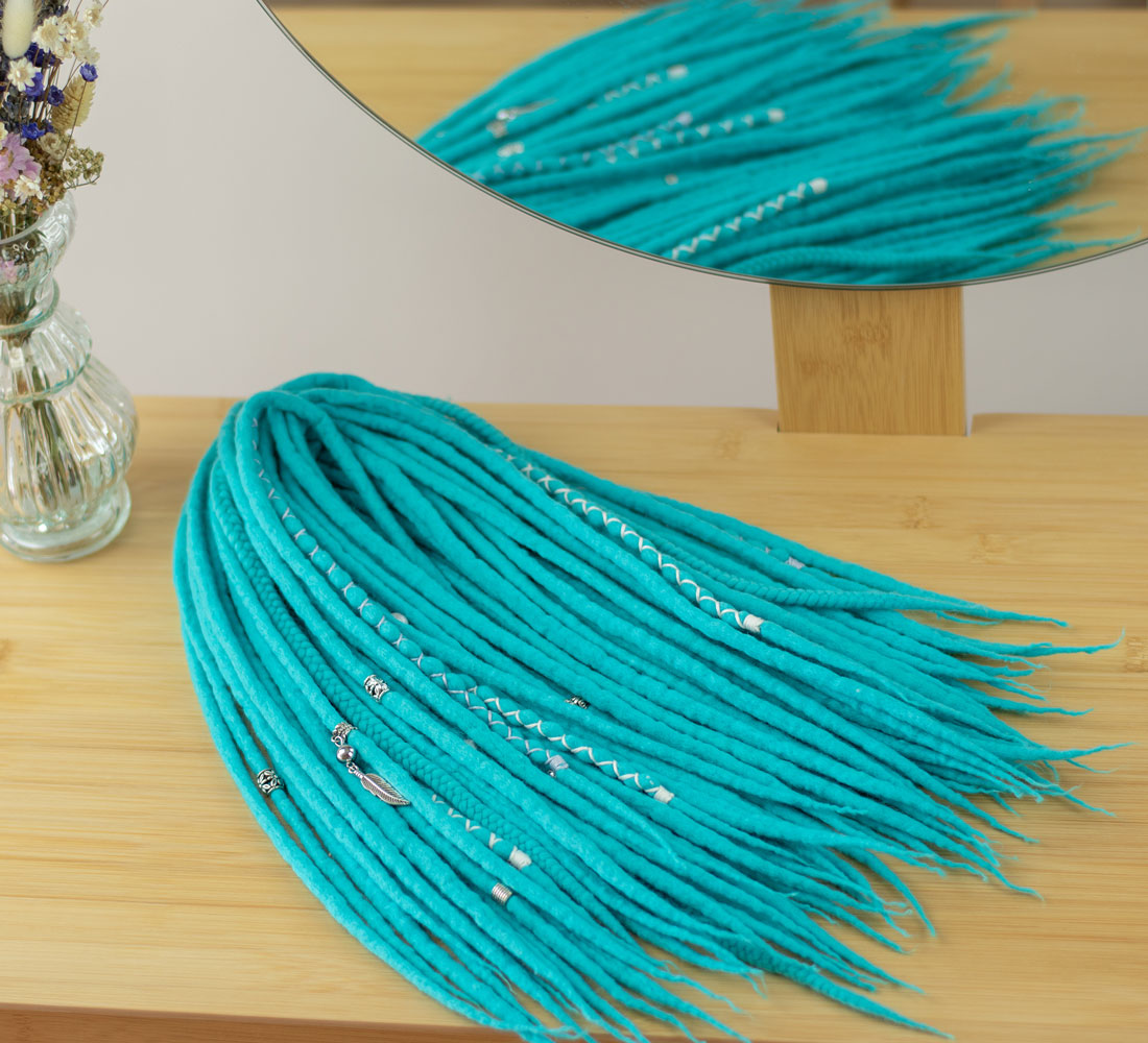 Our "Turquoise Wool Dreadlocks" - handcrafted from premium quality, extra soft merino wool, these dreadlocks are comfortable and easy to wear. Their vibrant turquoise hue not only adds a pop of color to your look, but also carries symbolism, representing calm, creativity and emotional balance. Enjoy these beautiful, cheerful wool dreadlocks in your everyday life!