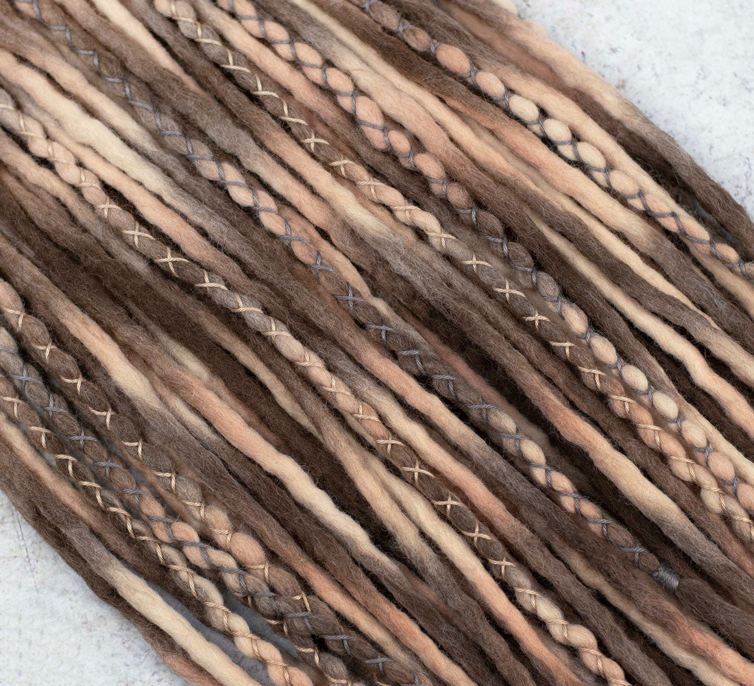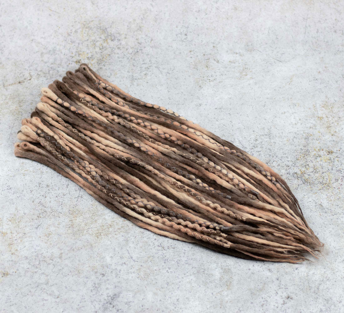 Our Brown blonde dreadlock extensions are carefully handmade from soft merino wool using the traditional art of wet felting. The merino wool ensures that these hair extensions are not only lightweight, but also incredibly comfortable to wear for extended periods of time. In addition, merino wool is naturally moisture wicking and breathable, making these wool dreads suitable for all-day wear without compromising on comfort.